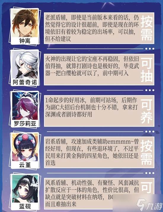 阿蕾奇诺:火神的出现让它的宝座不再稳固,但依I日值得抽,就算打剧诗也是极好的,毕竟武器一把白缨枪就可以了,前中期可入罗莎莉亚:1命起步的好用冰,前期可站场,后期作为副C大招后台机制也十分不错,拿来打深渊或者剧诗都好用