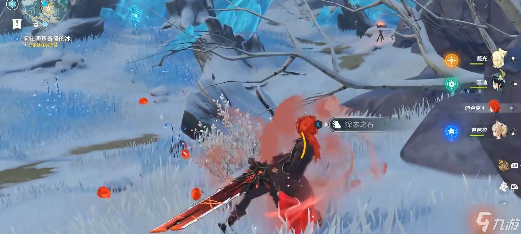 在雪山探险时,你会遇到一些无法用普通攻击或火元素技能解冻的大冰块。这些冰块需要借助一种叫深赤之石的特殊资源才能破除。深赤之石通常分布在冰块附近,外观是红色的矿石,击碎后会掉落红色能量球,捡起来就能获得短暂buff。带着这个buff去攻击冰块,就能成功解冻。记得buff有时间限制,如果距离冰块太远可能会失效,所以最好提前规划路线哦。