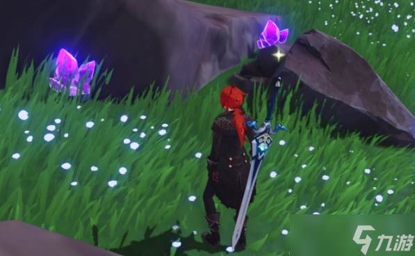 传过去之后顺着左侧的草坡一路往正西方向行进,下完草坡后再底部的枯树值四周,就可以一次性将四个紫晶块采到手。全部收下之后穿过前方的薄荷从并从岩壁底部往上爬,爬到顶端的小树苗那里就可以捡到一个紫晶块。捡完之后切出地图并传送到狭间之街正右侧的那片区域,角色落地之后后转并大跳坠落到脚下的蓝色四叶花丛中。角色触地之后开一下元素视野就可以将三个紫晶块拿到手。采集完之后从峡谷走出去并左拐到两座大山之间的隧洞中,进隧洞之后就可以在左侧的蜡烛台旁边收获到两个紫晶块。