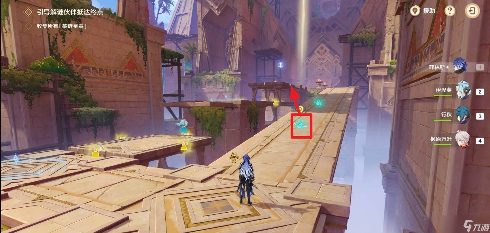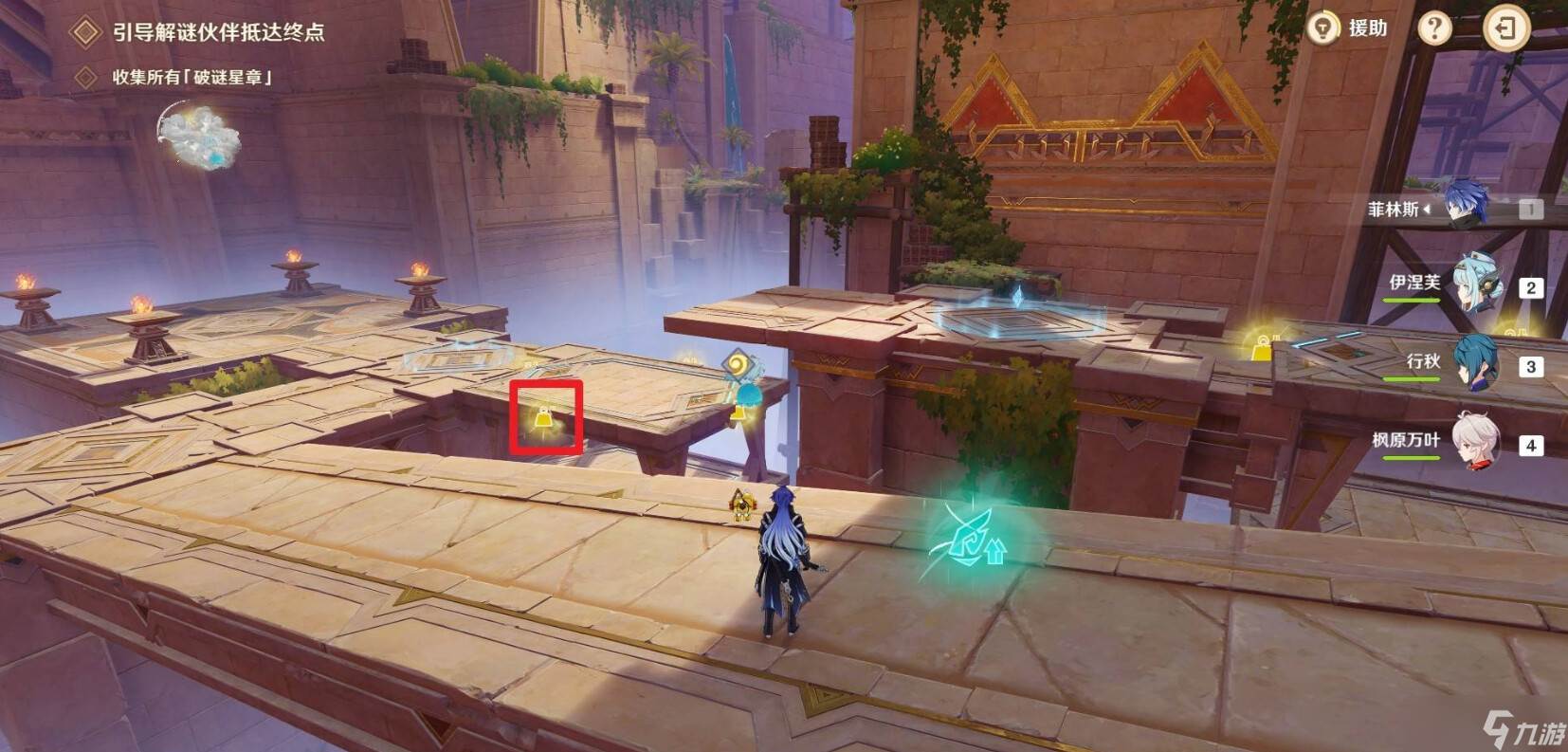 等待珐露珊解谜伙伴走上第二块石头平台时,用刚才拾取的蓝色增益替换掉第二块石头平台上的黄色增益。