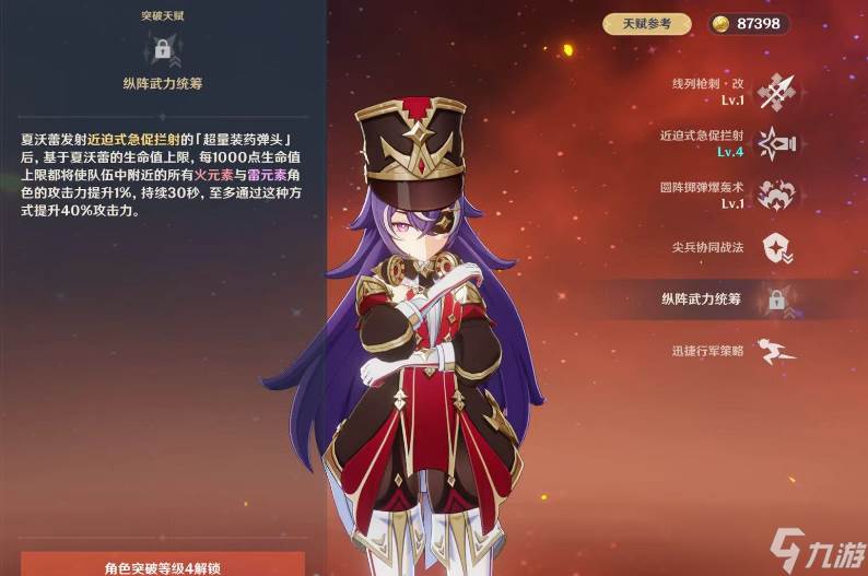 夏沃蕾是一个强力的火雷超载辅助角色,根据她的天赋,只有在队内角色全部都是火雷元素角色的时候,才会为造成过超载伤害的敌人造成火雷减抗。并且在队内角色造成火雷超载之后,获得到一枚更加强力的弹药头,长按使用元素战技把这个更加强力的弹药头发射出去命中敌人后,会为队内的火雷角色带来攻击的提升。在了解夏沃蕾基本的技能和天赋之后,不难发现夏沃蕾锁火雷超载配队。