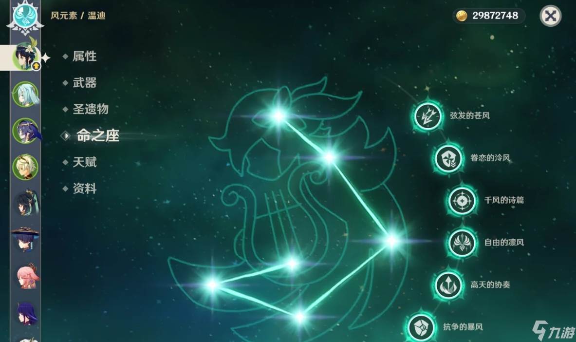 温迪的Q爆发技是“风神之诗”,能凝聚出由一缕缕风组成的箭矢。命中前方造成巨大暴风之眼,持续吸引周边的敌怪和物体。若碰到有水火冰雷类的,温迪的Q还能对其进行染色。我方在加点的时候可优先考虑风神之诗,再去点高天之歌。其固有天赋一是关于E的加持,能在长E后留下二十秒的风场。二是关于Q的增益,开大后可为温迪自身和染色队友回复十五点能量。天赋三则是跑图相关的,能减少滑翔所耗费的体力。温迪的关键命座在于6命,1命能在瞄准的时候产出分裂箭。