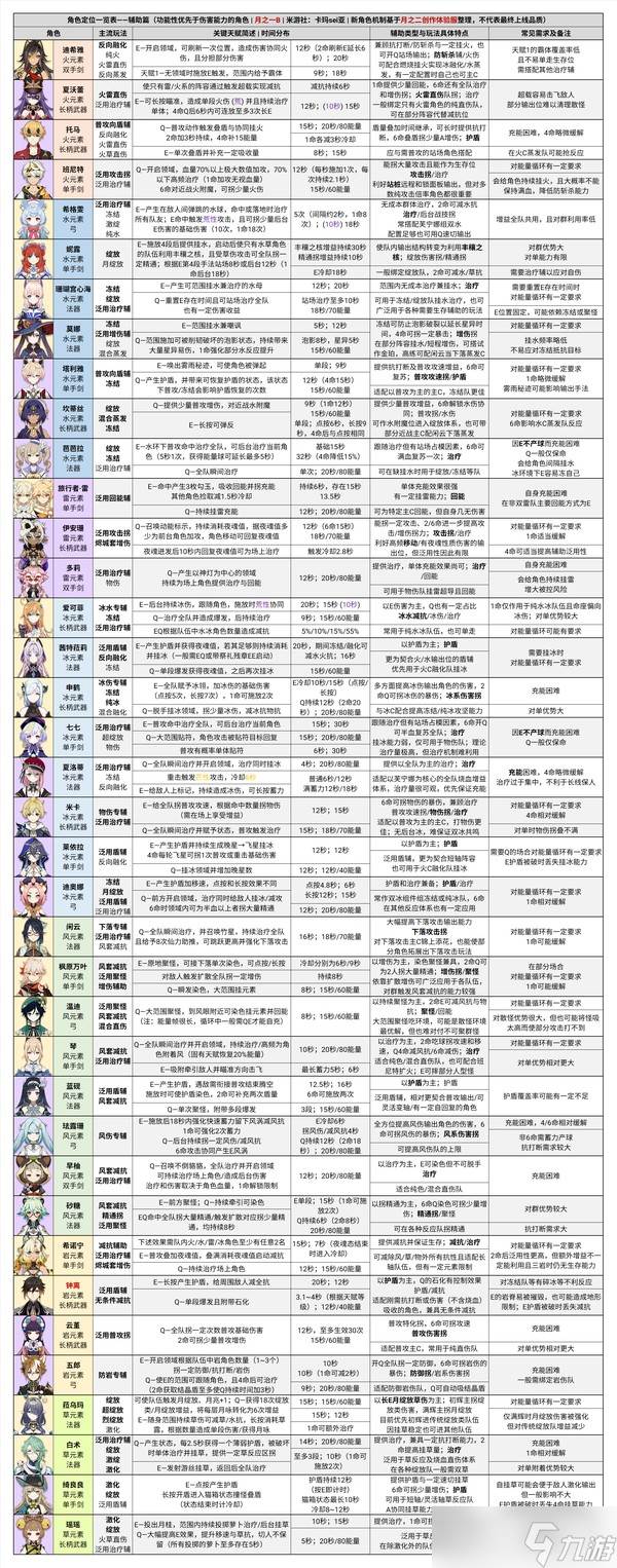 共4张图表,前3张为角色定位一览表,分别收录主流的主C、副C与辅助(每名角色都有至少1种定位),并根据优先级推荐主流玩法或使用建议、根据定位简述机制;第4张为功能性装备一览表,收录有团队收益的武器与圣遗物套装,并简述其功能性、获取方式及使用建议。