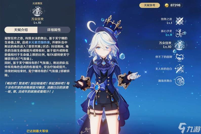 这一特质可以很好的用来破枫丹部分荒芒属性盾的怪物。并且当芙宁娜处于黑芙状态下,使用元素战技会召唤出来三只召唤物,在一定时间内持续攻击敌方,同时会消耗全队的血量来增加造成的伤害。而在白芙状态下,使用元素战技则会召唤出一个持续对前台角色治疗的召唤物。并且她的元素战技有一个很好的功能,可以增加玩家在大世界的体验,无论是处于黑芙还是白芙状态,只要使用元素战技就能在水上走。