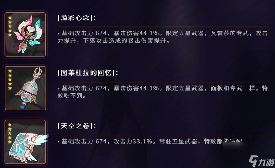 它和专武一样有着六百七十四的攻击白值,以及百分之四十四左右的暴伤。但它和溢彩不同之处在于,瓦雷莎不能吃到特效。T0.5的天空之卷有着出色的白值和攻击百分比,瓦雷莎和它的特效基本能适配。没有以上三种的情况下,再选择T1的纯水流华和流浪乐章。其中流华除了基础攻击和百分比,特效能完美适配瓦雷莎。流浪乐章的攻击和暴伤都很不错,仅仅在精通方面稍差一些。至于圣遗物中T0的要属长夜之誓,叠满buff有着百分百的增伤。初期过渡的时候可用黑曜四件套,所附带的伤害也算不错。