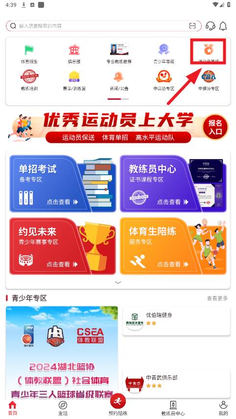 打开体教联盟app,进入首页后,点击运动员等级
