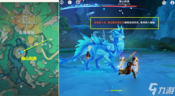 1、玩家来到boss【隐山猊兽】这里,打一会后,屏幕中间就会提示【冻结敌人后,通过融化等反应破除冻结状态,使其陷入瘫痪】;