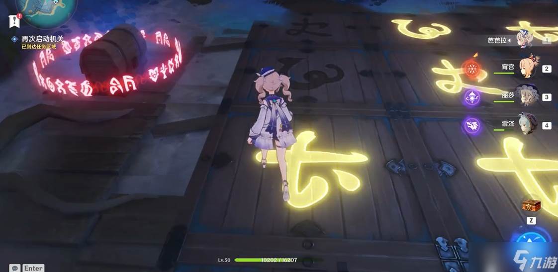 首先咱们得找到越石村的位置,它在清籁岛西北方向的小岛上,传送到附近的七天神像后往西北直走就能看到。进村后会遇到一群丘丘人围攻NPC藤原俊子,帮她解围后对话就能触发任务,她会给你一张藏宝图,图右下角的字母就是解谜关键。