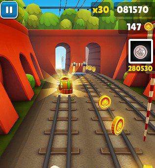 目标是尽可能跑的远,同时还要尽可能多的收集铁轨上的金币,游戏的视角是面向角色前进的方向。