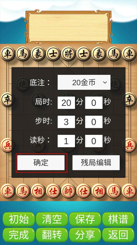 1、点击创建房间,页面就会显示底注、局时、步时、读秒等信息设置,将这些内容设置好了之后点击确定,就可以开始进入游戏了。在开始游戏前,棋盘的中间会显示房间号和金币底注数量。在创建房间前,你需要先获取20个金币才能开启房间。