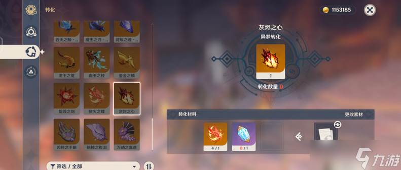 转换材料需要用到熔毁之刻或狱火之蝶,这些同样是女士掉落的副产物。打开合成台选择转化功能,左侧选中灰烬之心,右侧放入1个异梦溶媒+1个熔毁之刻/狱火之蝶就能1:1转化。建议平时多囤积些异梦溶媒,这东西在星辰商店和活动里都能换到。