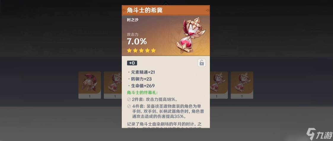 角斗士的希冀是五星圣遗物套装角斗士的终幕礼中的时之沙部件,其核心获取方式为击败世界等级3级以上的BOSS生物概率掉落。该圣遗物的基础属性为攻击力加成,2件套效果提升20%基础攻击力,4件套效果对单手剑、双手剑、长柄武器角色的普通攻击额外提供40%伤害增幅。