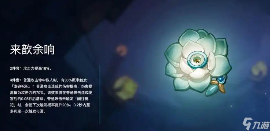 触发一次幽谷祝祀所需要的期望攻击次数为一点九左右,如果攻击间隔大于零点二秒的话,而且普攻次数足够多的情况下,四件套所带来的增益跟每两次普攻增加百分之七十的倍率接近。至于能给角色带来多少伤害提升,需要根据角色普攻倍率和佩戴的武器来定,因为角色普攻越低余响套的收益越大。比如说宵宫携带该套装,宵宫一轮平A有七箭,其中一二箭的间隔大约是零点一秒,四五箭的间隔为零点二五秒,因此对于余响套来说宵宫的有效普攻次数实际为六次,也就是能触发余响套三次。