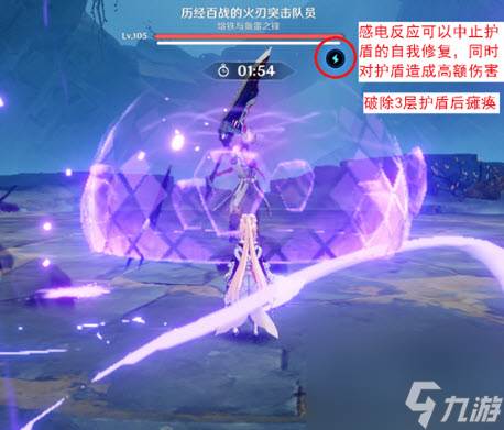 火刀队员入场后会即刻展开三层4.5%血量上限(约41万)的防护罩,护罩除了雷抗为0外,其余抗性均为70%,同时会高速进行自我修复,用感电或月感电攻击护罩后会终止其自我修复。同时,感电反应对护罩伤害加成增加600%,月感电反应增加200%。破除护罩后,火刀队员雷抗降低至-100%,其他元素抗性降低为-40%。