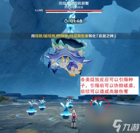 水螃蟹的机制非常简单,就是其在入场后会立刻飞天,同时在场上生成6个岩居之种,这个种子在受到任何一类绽放攻击,原绽放、妮绽放、超绽放、烈绽放之后就会对水螃蟹进行追踪爆炸,削弱其护盾。水螃蟹的护盾用6个转化后的岩居之种就可以击破,使其坠地,坠地后其会短暂瘫痪,之后就会持续在地面上产出岩居之种,此时我们可以用同样用绽放反应来引爆这些岩居之种,其会对水螃蟹进行攻击。