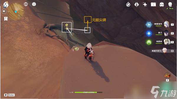 2、来到巨人峡谷那,用四叶印朝着东北方向飞过去,找到平台上的元能尖碑。