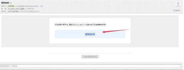 3、之后您需要到您所填写的邮箱或手机上,点击解锁账号,如下: