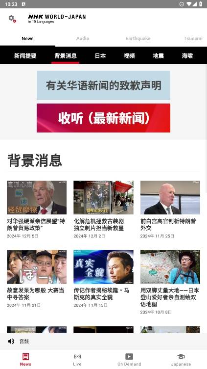 NHK WORLD新闻软件是由日本公共广播电视机构NHK推出的一款手机新闻浏览软件,为用户提供日本当地和整个亚洲的新闻最新资讯,让用户能在家了解世界实时动态,是一款非常好用的新闻软件,有需要的用户快下载试试吧。