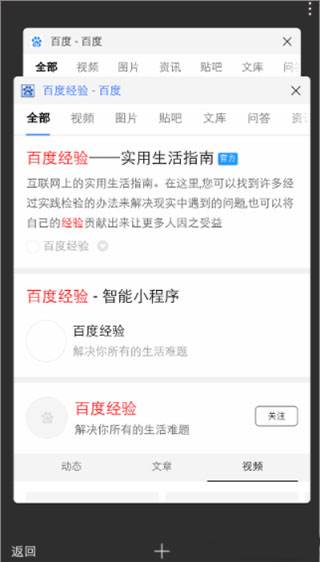 3、进入多窗口页面,就会将刚才的网页缩放为一个窗口,点击下方“返回”就可以退出多窗口。