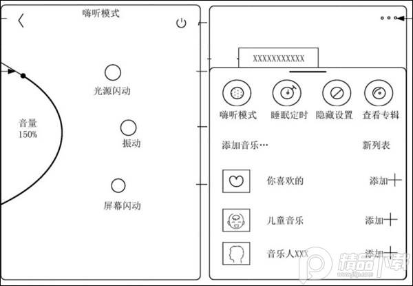 除了拥有音乐特效外,汽水音乐还有睡眠模式、隐藏设置、查看专辑等功能,满足了用户的使用体验。另外,用户也可以将当前播放的音乐添加至不同的歌单,通过草图可以看到,歌单有用户喜欢的曲库,也有儿童音乐,还有不同音乐人的歌单。