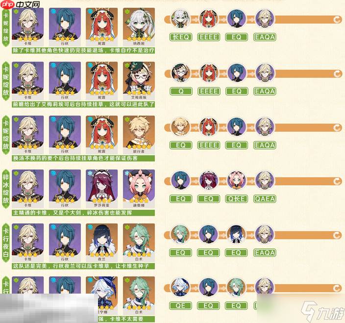 卡维主打绽放反应体系,在当前版本中可参与多种配队组合,包括经典的卡妮绽放队、结合碎冰机制的碎冰绽放队,以及以行秋、夜兰、白术为核心的卡行夜白队和卡行芙白队,灵活适配不同玩家的box配置。