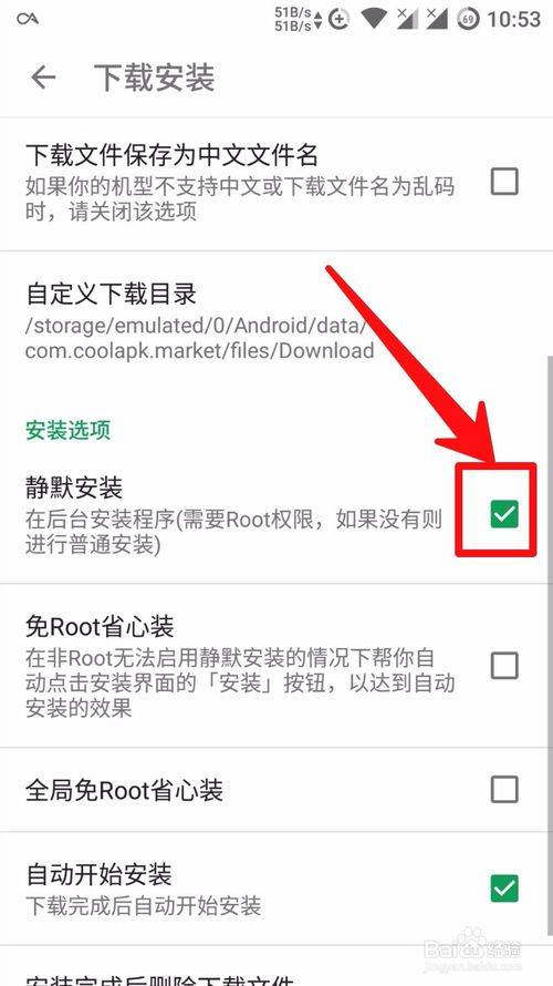 然后再这里我们可以看到一个静默安装的勾,将它打开即可。如果还是不能使用,请检查Root权限。