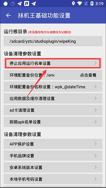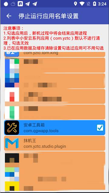 停止应用运行名单设置:选中后每次新机都会结束应用进程,在需要抹机的应用设置好应用后可以忽略,一般不需要特别设置