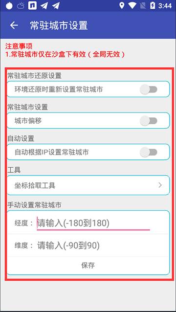 常驻城市设置:该功能仅在沙盒下有效,支持随机抖动偏移,根据IP设置常驻城市