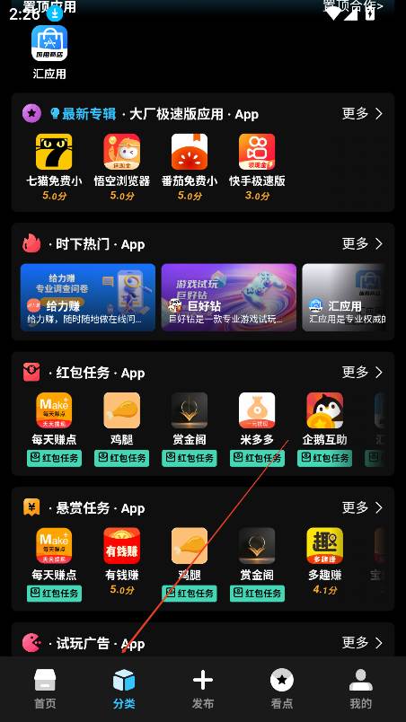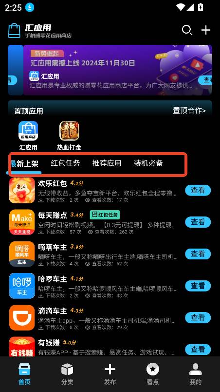 进入首页,可以查看最新上架,红包任务,推荐应用,装机必备几个板块的内容
