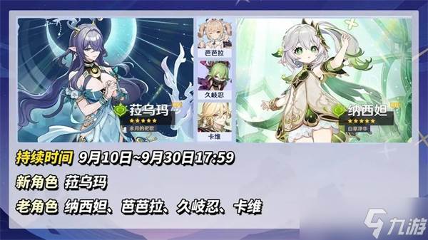上半祈愿池限定UP角色有菈乌玛、纳西妲、芭芭拉、久岐忍和卡维。