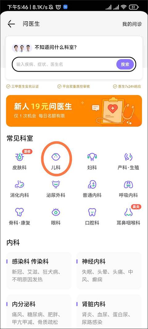 进入到问医生界面,我们这个时候要根据自己的需求选择问诊科室,小编先以儿科举例吧。