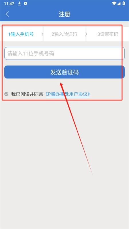 4、输入手机号,同意相关协议后,点击发送验证码