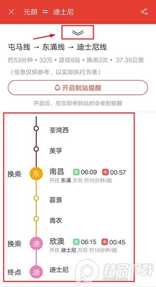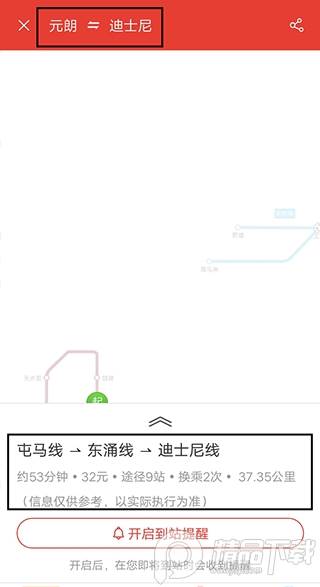 2、如下图显示,假如是需要元朗去往迪士尼,它会为你显示详细路程信息;