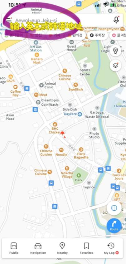 先是点击搜索框输入想去的地方英语或韩语。(不知道英语名字的用翻译软件)。