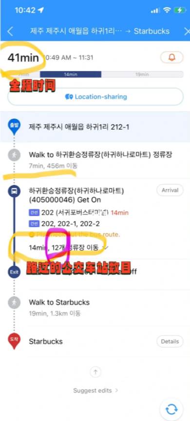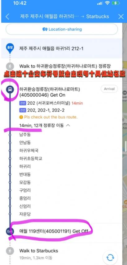点击一条路线就会出现具体导航方案,如图4和图5点击公交车标志,就有具体站台名字和多少站,这样就算不能看懂韩语也知道要坐几个站。