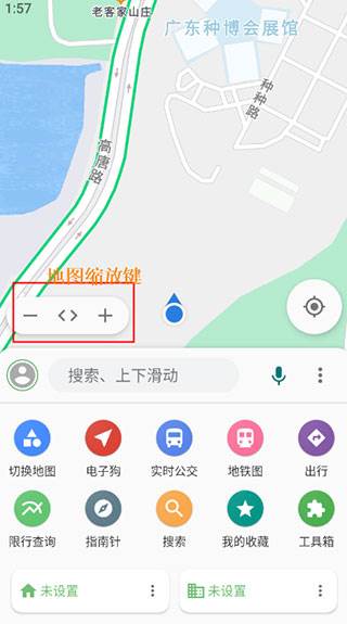 双指缩放手势、单/双指双击、点击放大(+)/缩小(-)按钮,即可缩放地图视图