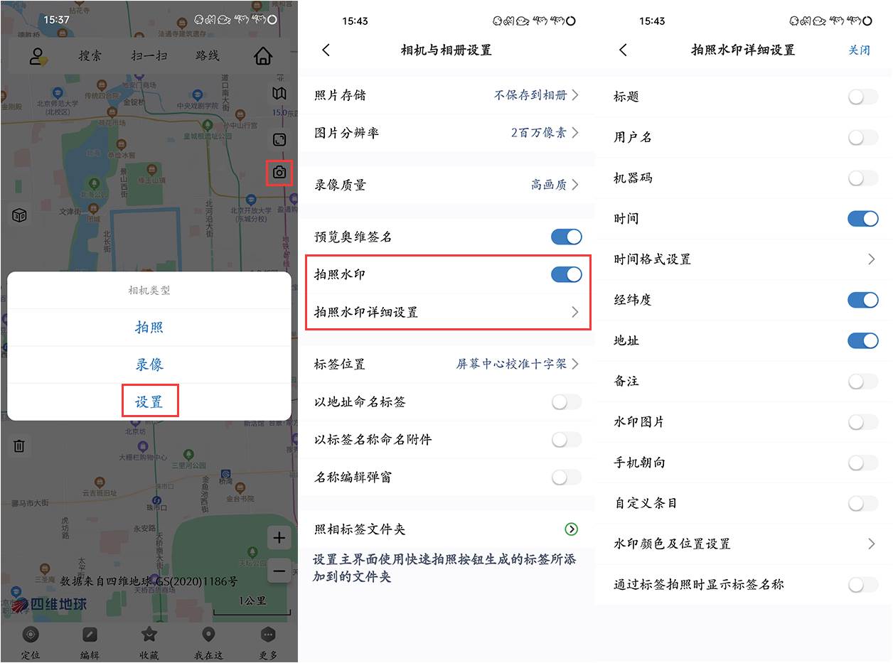 ①点击右上角的相机按钮→【设置】,开启【拍照水印】;
