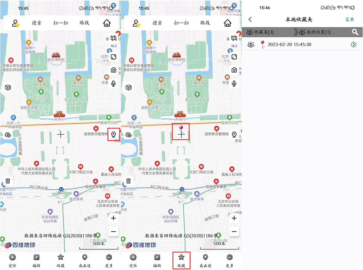 然后,您移动地图,将“十字架”移动到需要创建标签的位置,点击+按钮,即可创建。标签会自动保存在收藏夹,标签的名称是系统按时间自动生成的。