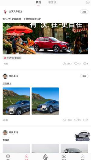 1、在本站下载安装宝沃汽车app,运行软件,可以看到由选车、发现、车生活、我的四个板块;