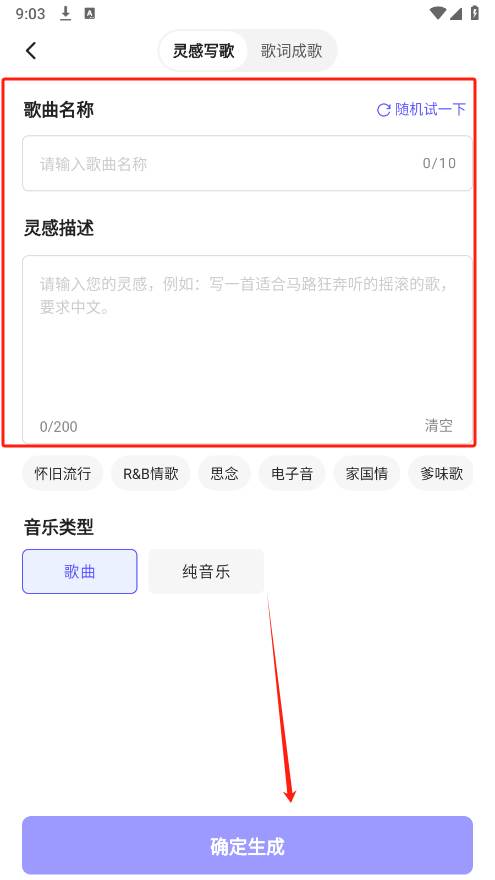 5、在音乐页面,为大家提供了灵感写歌和填词成曲等功能,输入歌曲名称和描述内容等信息即可快速生成