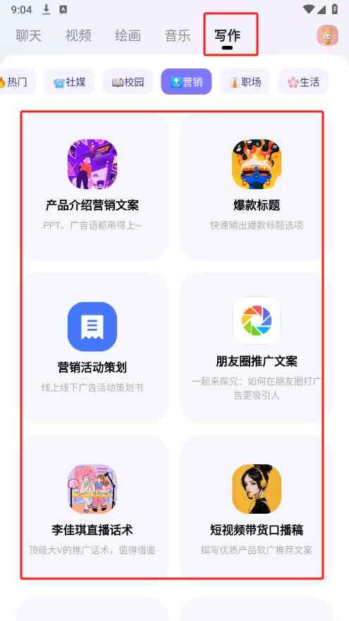 6、点击写作,这里为大家提供了超多写作功能,比如诗词写作、文案标题、演讲稿等,大家可以根据需求选择即可