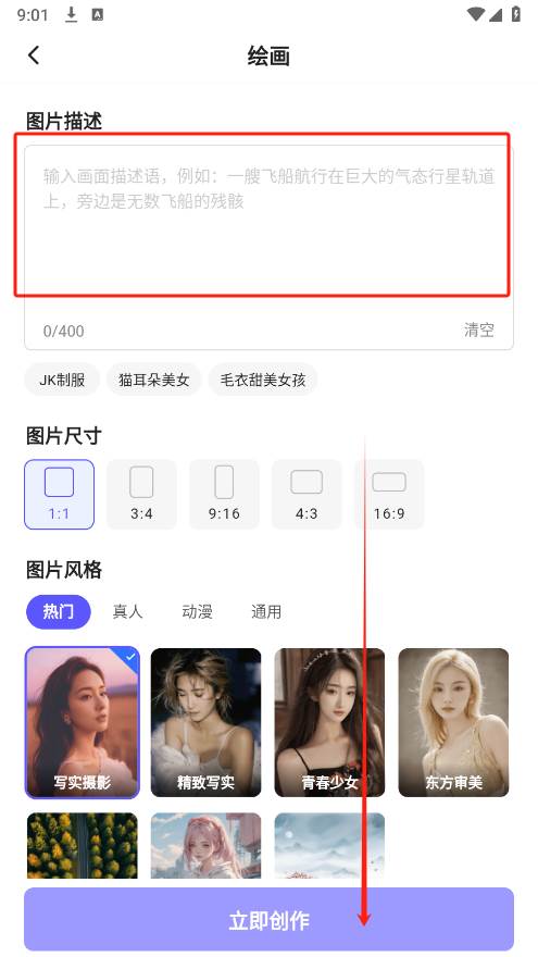 4、点击绘画,输入图片描述,选择喜欢的图片风格,点击立即创作即可
