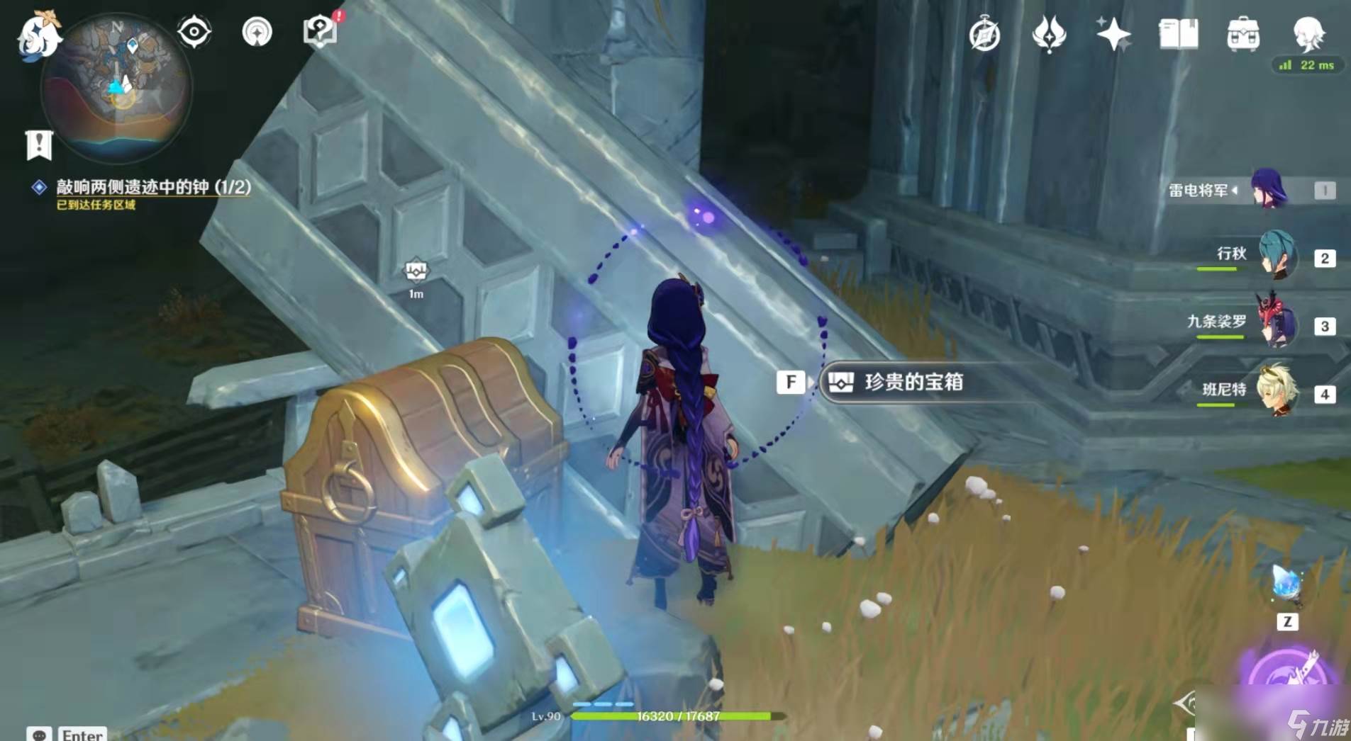 我们来到阳台上(携带流明石触媒)点亮灯柱后会出现一个珍贵宝箱以及一个向上的风场和一个仙灵。跟随仙灵到上层后解锁机关,再跟随仙灵到下层,清除黑泥后击败遗迹重机即可敲响钟。