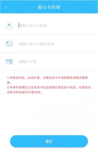 点击APP首页的爱心卡年审按钮,输入持卡人姓名、身份证号、卡号即可在线年审,年审成功后,请务必在车载机左侧面贴卡补登,才能将次数写入卡中,如下图所示: