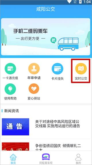 1、打开咸阳掌上公交app,在首页找到并点击“实时公交”按键;