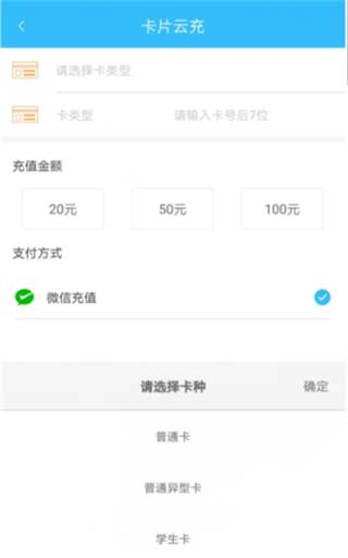 点击APP首页的卡片云充按钮,可在线充值普通卡、普通异形卡、学生卡,充值成功后请务必在车载机左侧面贴卡补登,才能将金额写入卡中,如下图所示: