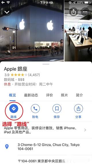 4、确认完目的地详情后选择“路线”,这里的目的地详情有非常多的实用情报例如营业时间、电话、主页、照片、店铺评价等,且基本都自动翻译成中文,非常方便!