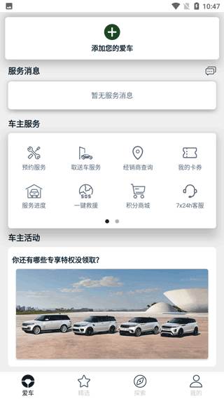 3、点击下方的爱车页面,会看到上方可以在这里添加你的爱车可以把你的车辆在这里进行绑定,下方有一些车主的服务的基本功能;