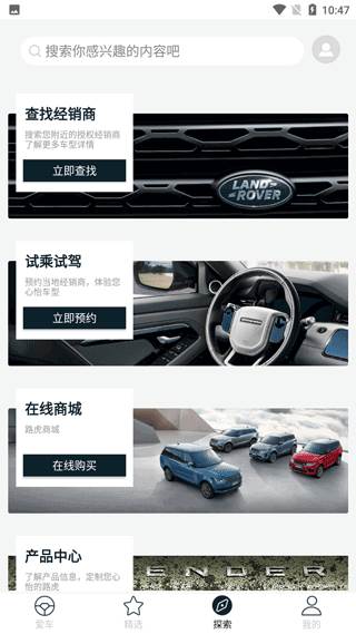 4、点开搜索,内容中有查找经销商、试乘试驾、在线商城等功能,你可以在这里找到最近的经销商也可以在这里进行预约试驾甚至这里还可以线上看车。