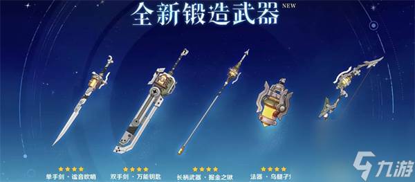 原神6.0出了什么新武器,出了五把新四星武器(均可锻造),分别是单手剑【谧音吹哨】、双手剑【万能钥匙】、长柄武器【掘金之锹】、法器【乌髓孑灯】、弓【罗网勾针】。还有两套新圣遗物,分别是:【穹境示现之夜】、【纺月的夜歌】。